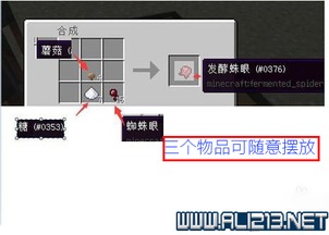 2. 接下来,制作发酵的蜘蛛眼。将糖、蜘蛛眼和灰色蘑菇放入工作台,即可合成发酵的蜘蛛眼。